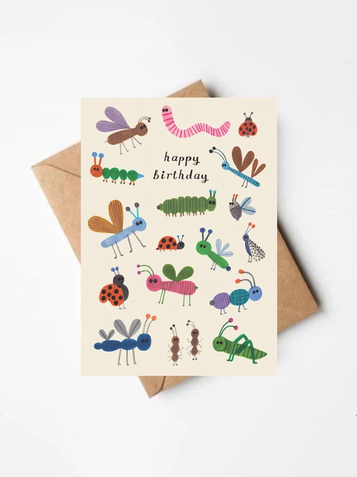 • Cette jolie carte d’anniversaire est illustrée de petits insectes rigolos dessinés avec des formes simples et des couleurs gaies.
